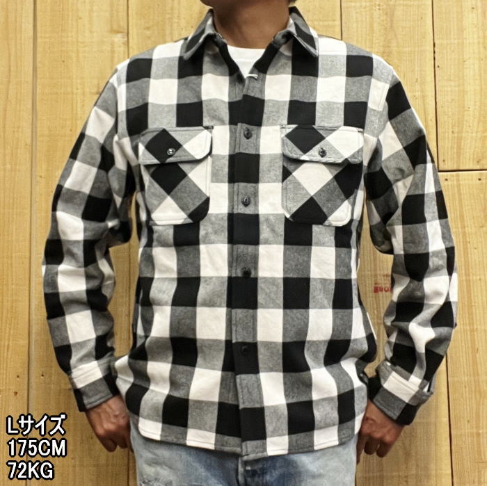 ◆品名;HEAVY FLANNEL SHIRTS ヘビー フランネルシャツ ■仕様;未使用/新品 ◆サイズ;M;肩幅;45CM/身幅;54CM/着丈;71CM/袖寸;61CM ◆サイズ;L;肩幅;46CM/身幅;56CM/着丈;72CM/袖寸;62CM ◆サイズ;XL;肩幅;47CM/身幅;58CM/着丈;73CM/袖寸;63CM ※洗いをかけてありますので物により若干の差がございます。 ◆色;ホワイト×ブラック ◆詳細;生地;綿100%、ヘビーウェイト(厚手地)、猫目ボタン、洗い加工、Made in CHINA ★コメント; 数々のアメリカンワークブランドがある中でBIGMIKEの強みの一つワークシャツ。その中でも今尚、人気が高騰し入手困難なアメリカ古着を代表する『Flannel Shirts』はいい意味で荒さの残る魅力的なアイテムです。 当時の雰囲気を感じさせる。猫目ボタン、2本針巻き縫い、フラップ付き胸ポケットなどビンテージワークシャツのディテールを忠実に再現し現代シルエットにフィットさせました。 風合いを消さないように” インド綿 ”を使用した生地は洗いをかけると縮みが出る為、着丈はやや長めになっております。同時に全体の生地が詰まり2、3回洗った後の表情はたまりません。 着用できるシーズンが長く【秋?冬の暗めのカラー】【冬?春の明るめのカラー】カラーを分けて楽しむのもいいですね。またスタイリングもワンサイズアップさせ軽めのアウター感覚でスウェット上にいかがでしょうか? 古着では味わえないシルエット、生地感や風合いは流石の一言です。変わらずな定番の良さはチェックシャツは苦手という方にも是非チャレンジしていただきたい1枚です。