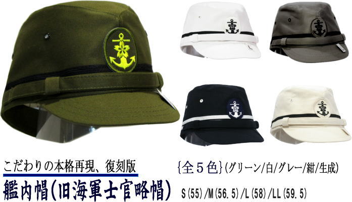 現在も保安庁や自衛隊の制帽を製造している 「CHAPEAU SAOTOME(シャポーサオトメ)」ブランド。 艦内帽(旧海軍士官略帽)生産完了のお知らせ 長らく皆様にご愛好いただきました「艦内帽(旧海軍士官略帽)」ですが メーカーのシャポーサオトメ様の都合により最終製造の現在庫分にて 製造を完了することになりました。色サイズ共に在庫限りになります 誠に残念ですが、一考されておられた方どうぞお早目のご購入をお願い致します 最終製造にあたり材料費高騰にて価格が変わりましたが、何卒ご了承ください デザインはもちろん、素材や縫製、 帽裏の印刷書体まですべてオリジナル通り。 そのまま旧海軍に納品できる仕様の 本格的な略帽です。 後ろにサイズ調整機能がありますので、 頭に合わせて調節が可能。 日本製の確かな品質です。 知る人ぞ知る、旧海軍士官略帽。 ぜひ一度手にしてみてください。旧海軍士官略帽を正確に再現 現在も保安庁や自衛隊の制帽を製造している 「CHAPEAU SAOTOME(シャポーサオトメ)」ブランド。 デザインはもちろん、縫製、 帽裏の印刷書体まで、ほぼオリジナル通り。 そのまま旧海軍に納品できる仕様の 本格的な略帽です。 後ろにサイズ調整機能がありますので、 頭に合わせて調節が可能。 日本製の確かな品質です。 知る人ぞ知る、旧海軍士官略帽。 ぜひ一度手にしてみてください。 こだわりのエンブレム *2015年7月頃より、 綿35%/ポリエステル65%の生地に変更 致しましたので、ご了承下さい。 エンブレムのマークはこだわりの刺繍。 イカリのマークは立体感があり存在感抜群。 適度に厚みがあるしっかりとした作りです。 本格的な再現 帽裏の印刷部分。 氏名等の記入欄まで忠実に再現。 もちろん書体まですべてオリジナル通りです。 ※裏地は全色生成色です。 頭周り■ S(55)/M(56.5)/L(58)/LL(59.5) 深さ■ 約11cm つば■ 約5.2cm 大きさ 縦:約23.5cm 横:約18.5cm 色 生成/白/グレー/紺/グリーン 素材 綿35%/ポリエステル65% 製造国 日本製 品質表示 ※数値はあくまで目安ですので ご了承ください。 サイズによって若干誤差がございます。