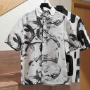 シャツ メンズ 半袖 サッカー生地 グラフィティプリント ゆったり 薄手 ストリート系 通気性 吸湿速乾 シワになりにくい 黒灰 欧米風 カジュアルシャツ