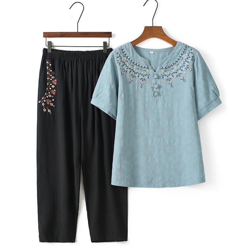 セットアップ レディース シニア 春夏 綿麻 半袖 通気性 薄手 ゆったり 大きいサイズ 祖母 ミセス 無地 刺繡 九分丈パンツ 体型カバー リラックス 部屋着