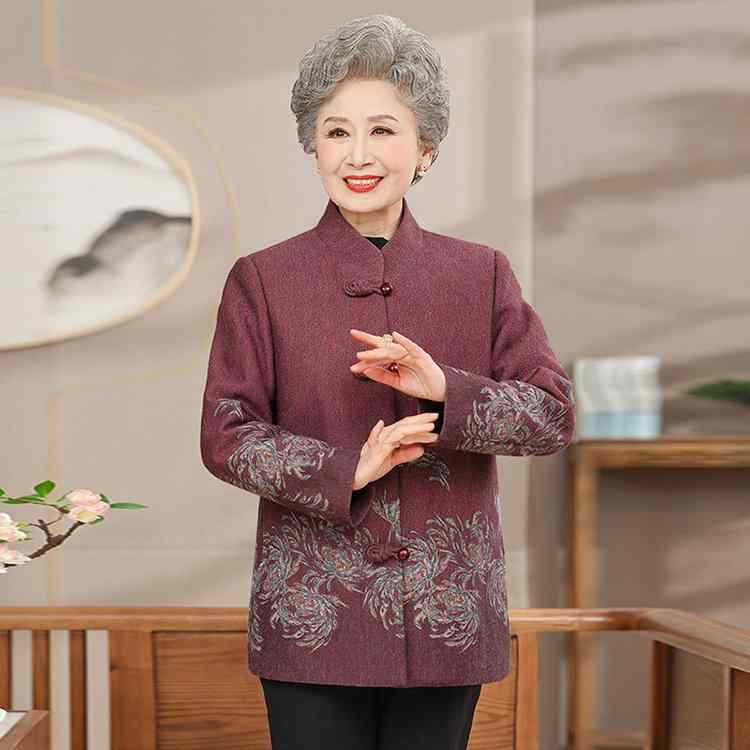 アウター レディース シニア 祖母 春用 ウール調 唐装 コート 綿ポリエステル素材 刺繡 エレガント レトロ 誕生日 お祝い プレゼント ママ フォーマルウェア ミドル丈 ワインレッド ディープパープル 普段使い お出かけ 上品 華やか