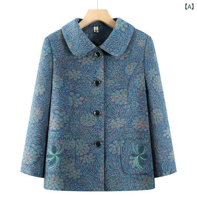 アウター レディース シニア 春秋 ジャケット 花柄プリント 綿ポリエステル ポケット付き ゆったり 体型カバー 上品 きれいめ カジュアル 普段使い お出かけ 旅行 赤 レッド 青 ブルー