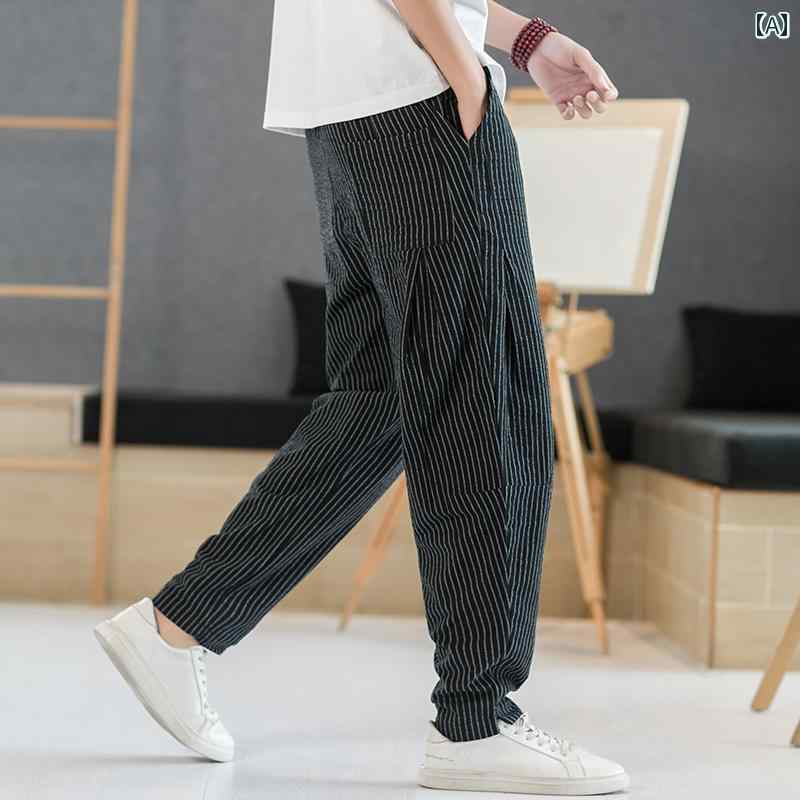 メンズ 夏 カジュアル パンツ ストライプ リネン 九分丈 中華風 大きいサイズ ワイド レッグ