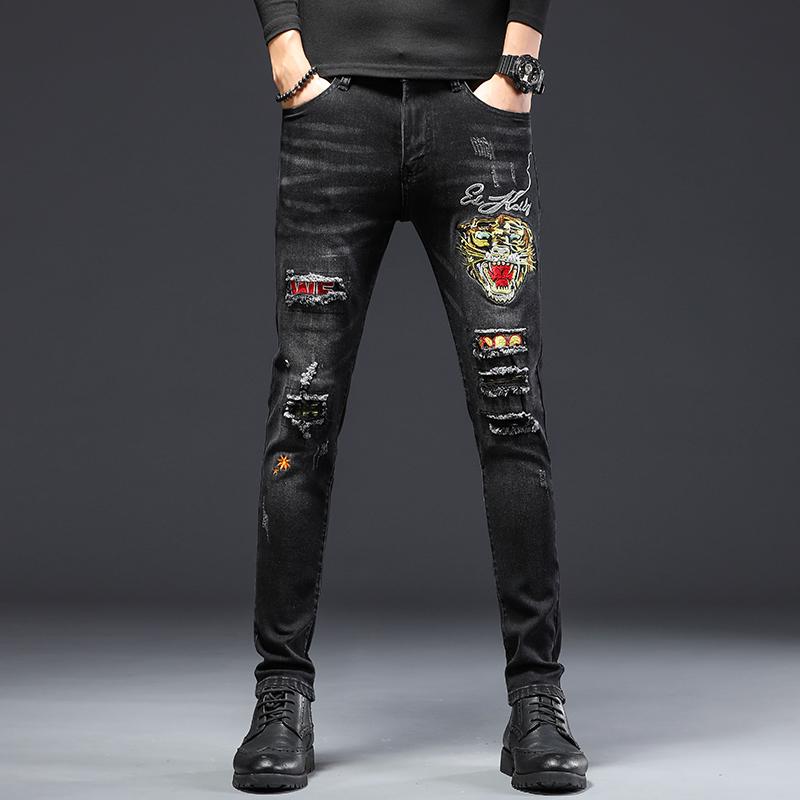 デニムパンツ カジュアル おしゃれ スタイリッシュ メンズ 破れた ジーンズ パッチ 中華風 膝 傷 古風 刺繍 花