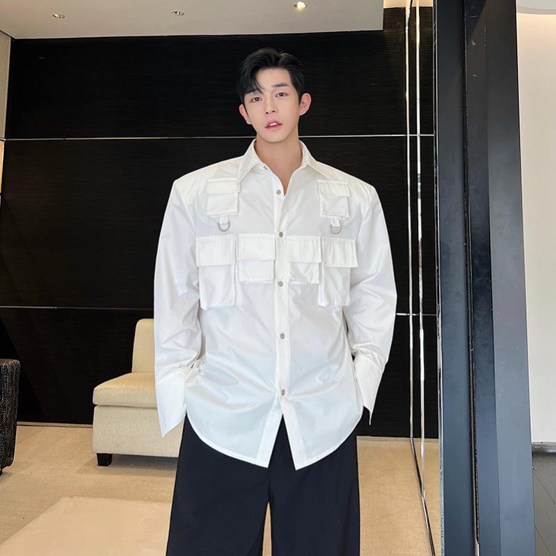 シャツ メンズ 長袖 トップス おしゃれ 男性用 白 ハイエンド 小さい ポケット 機能的 作業着 肩 パッド