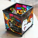 ガラスとブリキでできた、アンティーク調のキューブボックス。 色鮮やかなハロウィンのステンドグラス風デザイン。 ジャック オ ランタンやお化けがカラフルで 光を当てるととてもゴージャスできれい。 ペン立てや小物入れとしてずっと使えます。 中にキャンドル風ランプを入れてもおしゃれ。 底面が鏡になっているので、 側面の図柄が反射して、万華鏡のよう。 高さ10.5cm×9.5cm×9.5cm。 ※ご注意※コチラの商品は、一つ一つハンドペインティングで仕上げた手作り品です。精巧に作られた高級品でも、規格通り作られた工業製品でもありません。ですので、写真と全く同じではなく、一つ一つ微妙な差があり、それも個性の一つです。表面にひび割れや傷、削れたあと、汚れのようなもの、塗装にむら等がありますが、手作り感がある商品ですので、その風合いや素朴さを楽しんでください。あらかじめご理解の上、お求めいただきますようお願いいたします。