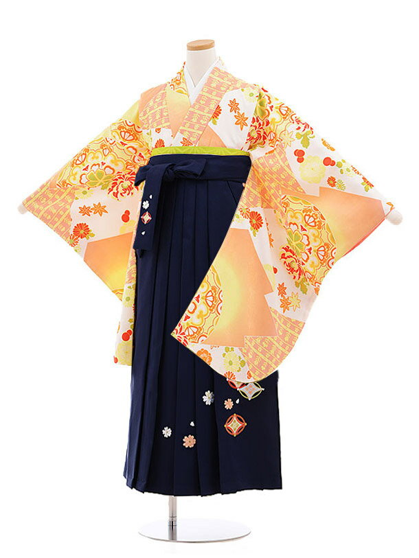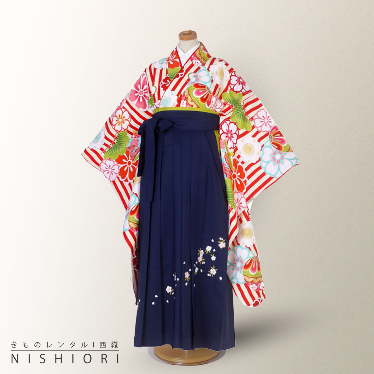 【レンタル】卒業式 二尺袖 ジュニア 着物 袴 フルセット 【十三参り 卒業式 貸衣装 晴れ着 小学生】白 オレンジ ストライプ 紺 刺繍 無地