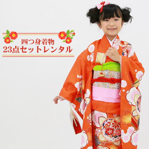 【レンタル】 七五三 着物 7歳 レンタルフルセット 四つ身着物23点セットレンタル「オレンジ地に桃と矢絣」女の子 ひな祭り 雛祭り 衣裳 お正月 結婚式 発表会 晴れ着