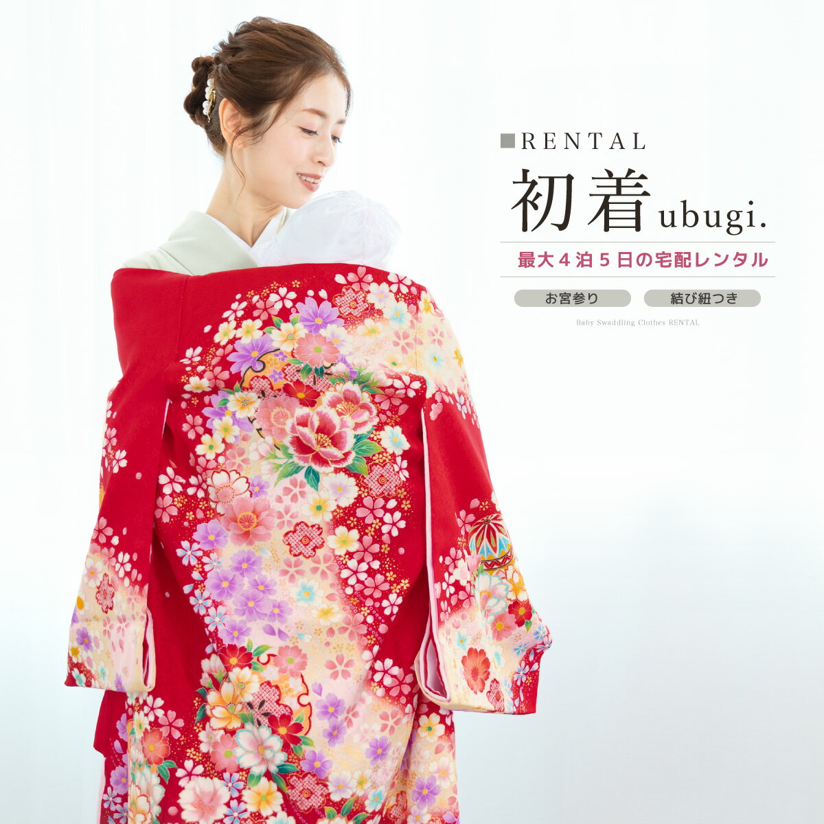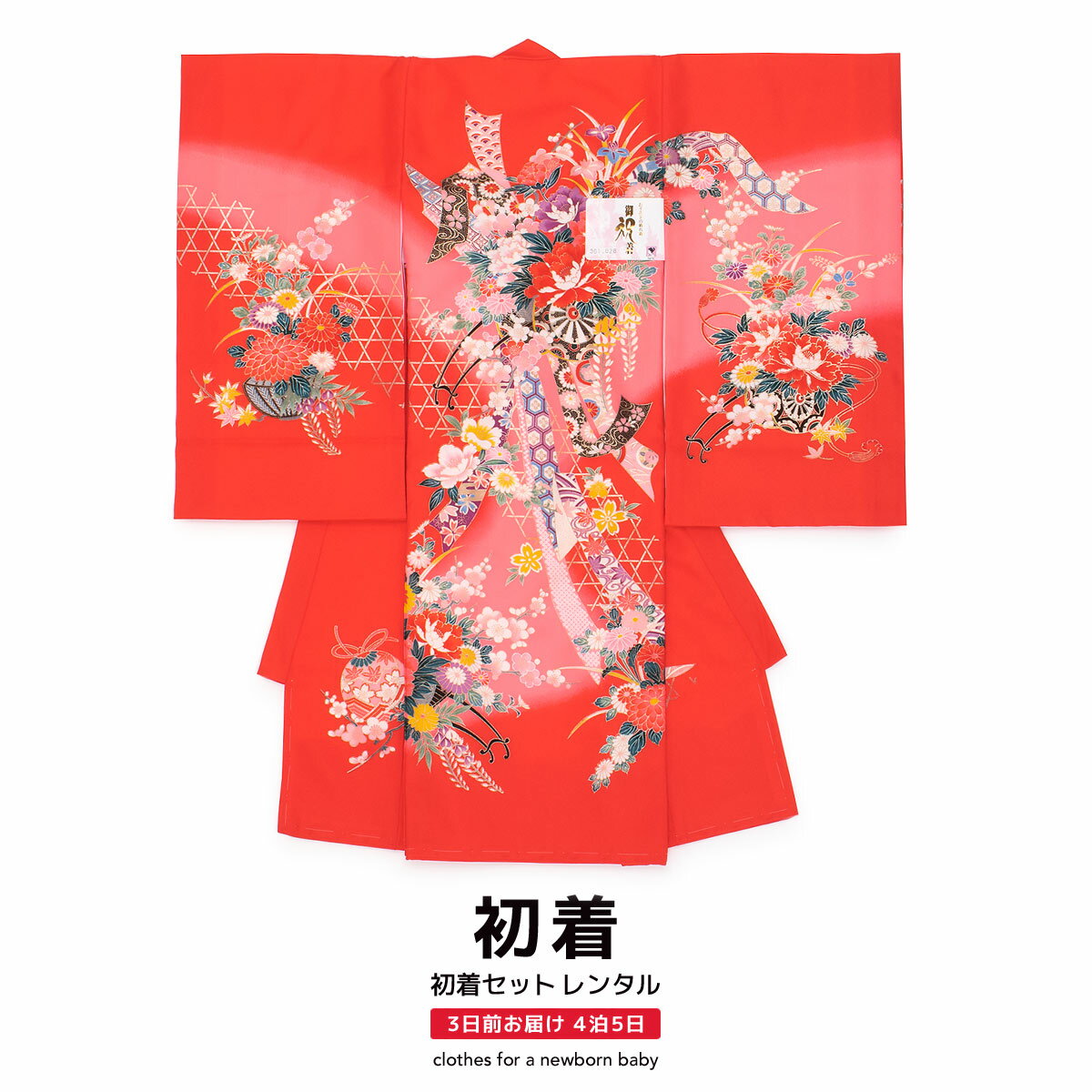 【スーパーSALE限定☆最大3000円クーポン配布中☆】【レンタル】 お宮参り 女の子 レンタル 産着 フルセット 赤 レッド 朱色 牡丹 梅 藤 桜 菖蒲 御所車 籠目 熨斗 女児 掛け着 うぶぎ 祝着 記念撮影 赤ちゃん 祝い着 帽子 よだれかけ 創美苑 往復送料無料