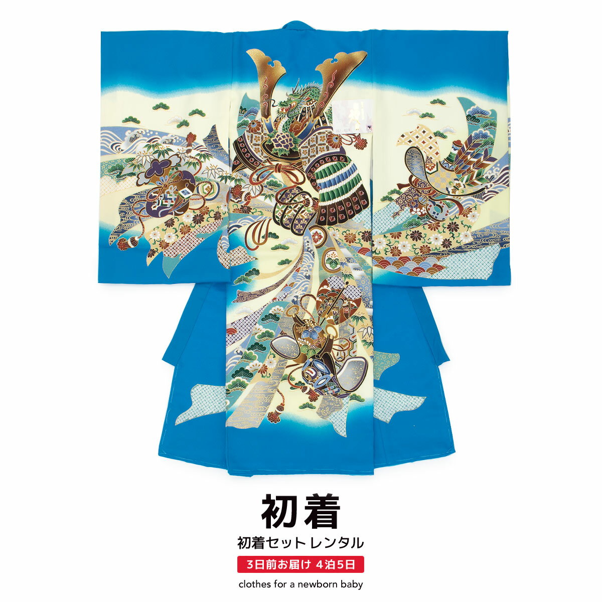 【スーパーSALE限定☆最大3000円クーポン配布中☆】【レンタル】 お宮参り 男の子 レンタル 産着 フルセット 青 ブルー クリーム 竜頭兜 束ね熨斗 鐙 軍配 矢羽根 男児 掛け着 うぶぎ 祝着 記念撮影 赤ちゃん 祝い着 帽子 よだれかけ 創美苑 往復送料無料