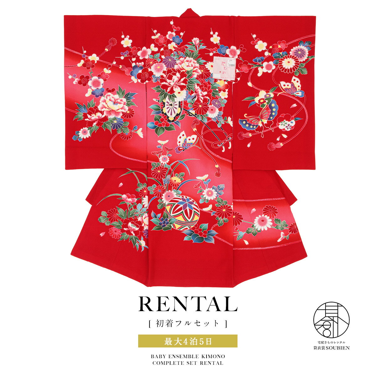【スーパーSALE限定☆最大3000円クーポン配布中☆】【レンタル】 お宮参り 女の子 レンタル 産着 フルセット 赤 レッド 牡丹 梅 菊 桜 雪輪 手鞠 女児 掛け着 うぶぎ 祝着 記念撮影 赤ちゃん 祝い着 帽子 よだれかけ 創美苑 往復送料無料
