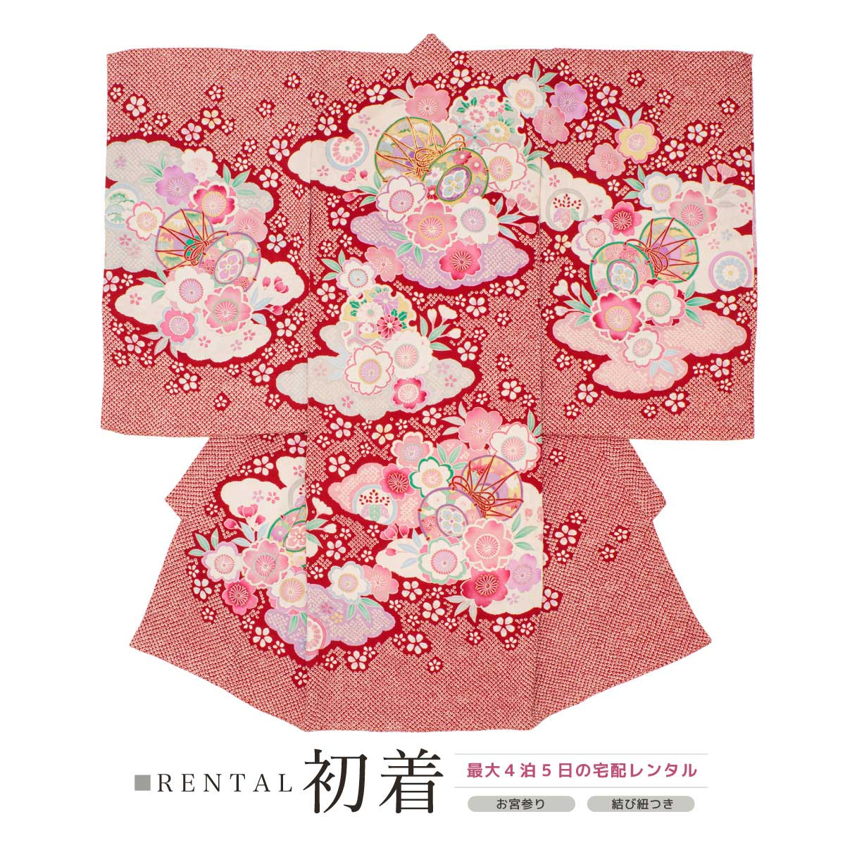 【スーパーSALE限定☆最大3000円クーポン配布中☆】【レンタル】 お宮参り 女の子 レンタル 産着 フルセット 赤 レッド 絞り 鼓 桜 雪輪 雲取り 通年 掛け着 うぶぎ 祝着 子供着物 産着セット 赤ちゃん 祝い着 帽子 よだれかけ 創美苑 往復送料無料