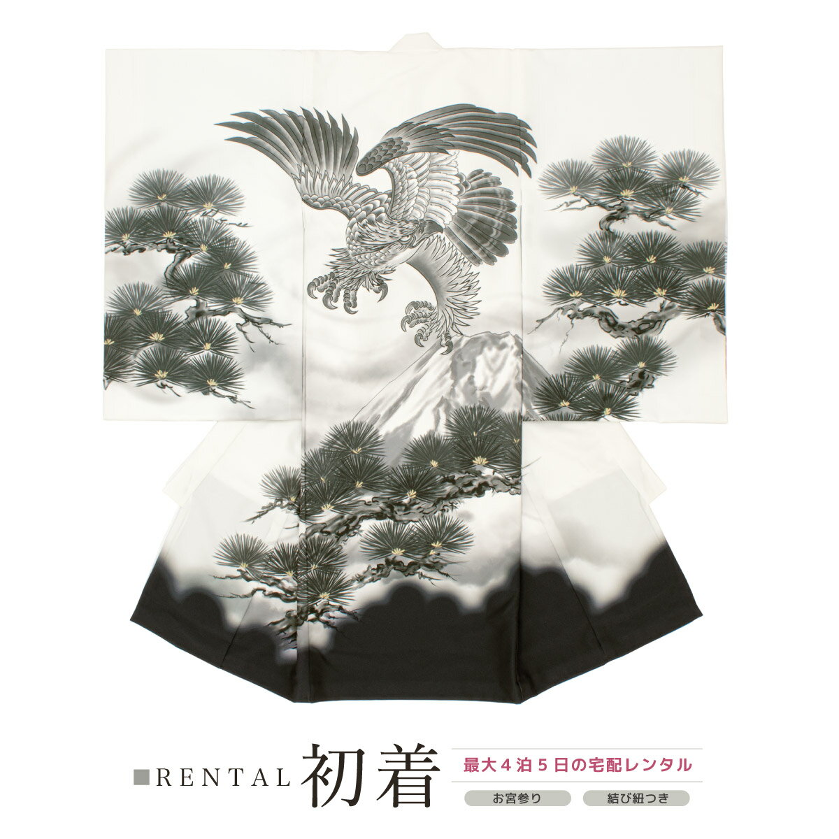 【スーパーSALE限定☆最大3000円クーポン配布中☆】【レンタル】 お宮参り 男の子 レンタル 産着 フルセット 白 濃灰色 グレー グレー 鷹 松 通年 掛け着 うぶぎ 祝着 記念撮影 子供着物 産着セット 赤ちゃん 祝い着 帽子 よだれかけ 創美苑 往復送料無料