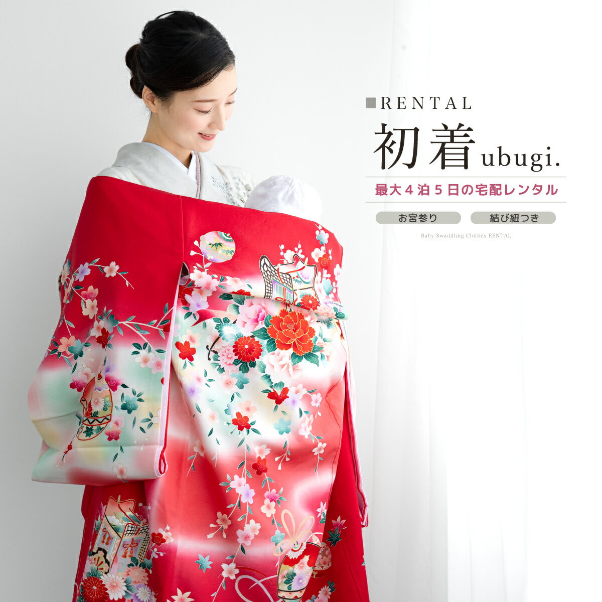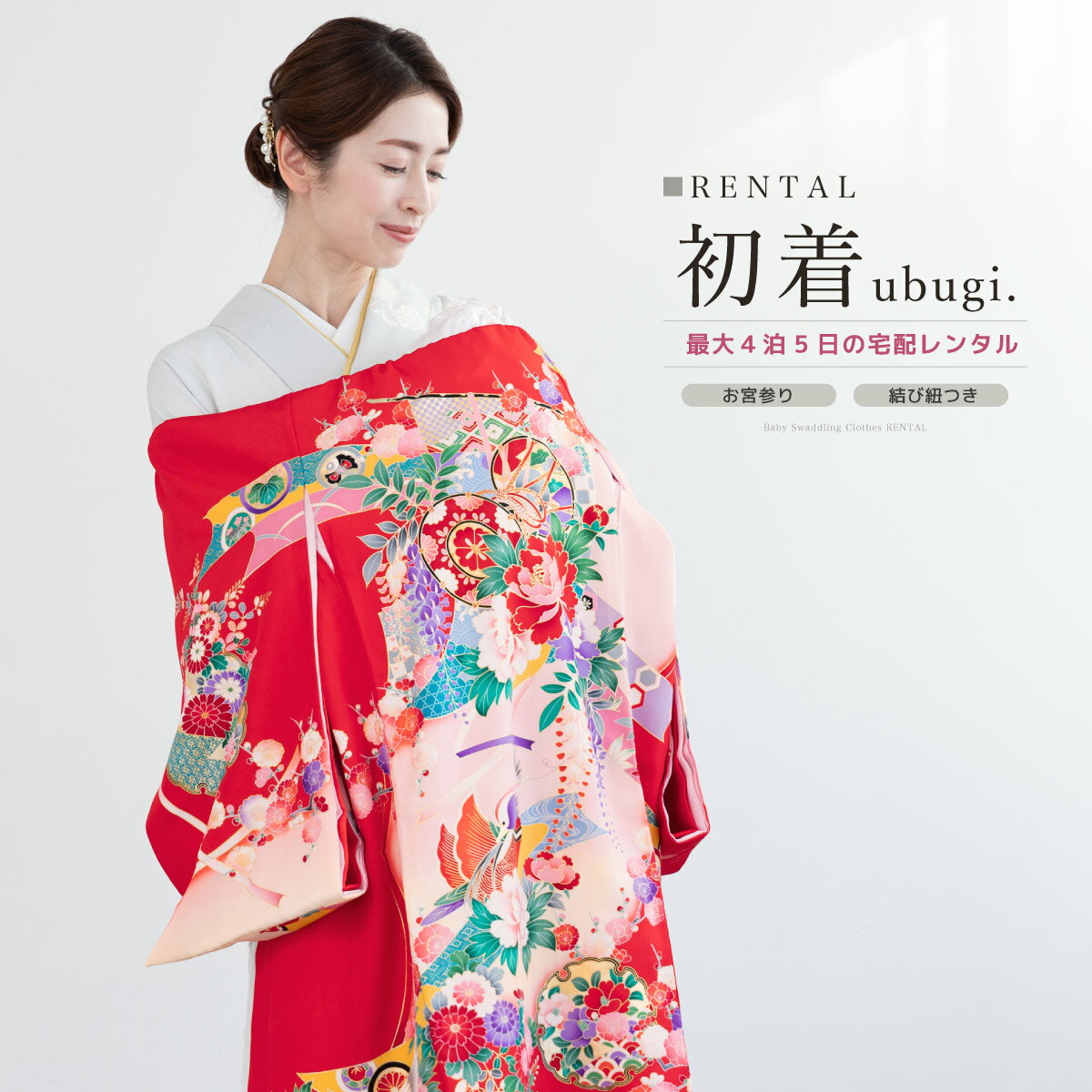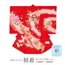 【スーパーSALE限定☆最大3000円クーポン配布中☆】【レンタル】 お宮参り 女の子 レンタル 産着 フルセット 赤 牡丹 藤 花車 扇 掛け着 うぶぎ 祝着 記念撮影 子供着物 産着セット 祝着セット 赤ちゃん 祝い着 帽子 よだれかけ 創美苑 往復送料無料