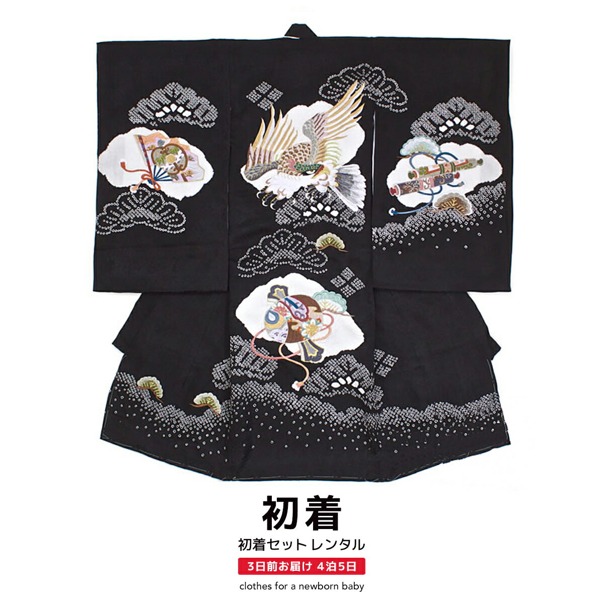 【スーパーSALE限定☆最大3000円クーポン配布中☆】【レンタル】産着 お宮参り 男の子 フルセット 鷹 小槌 鏡 ブラック 黒 掛け着 うぶぎ 祝着 子供着物 産着セット 祝着セット 赤ちゃん 祝い着 帽子 お守り袋 よだれかけ 創美苑 往復送料無料