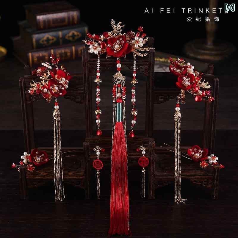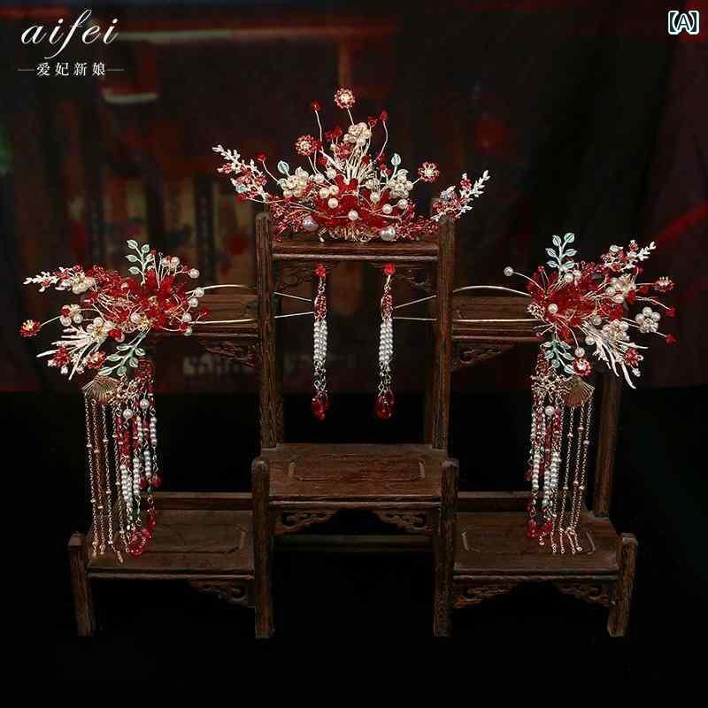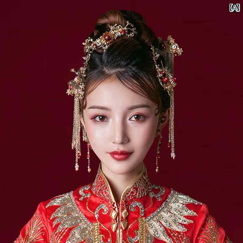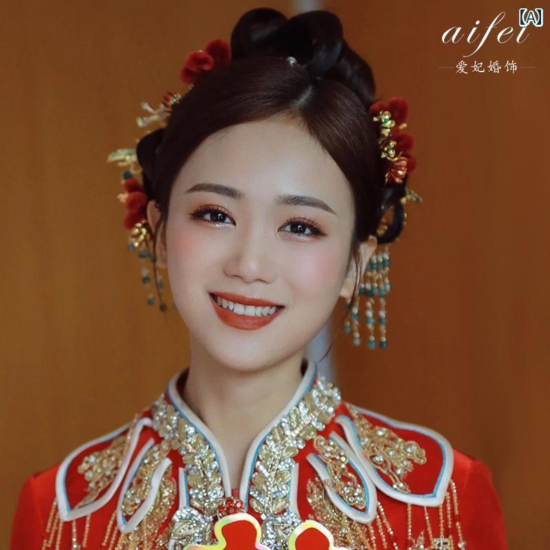 花嫁 Xiuhe 頭飾り チャイナ風 結婚式 赤 レトロ タッセル スーツ 衣装 マレー ガウン Xiuhe 衣装 アクセサリー