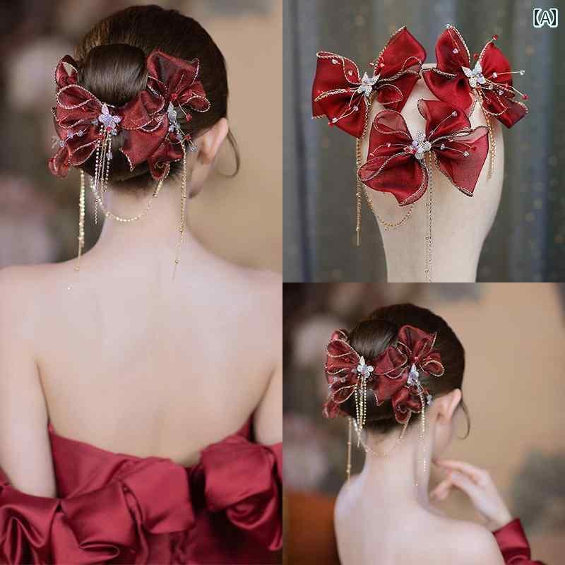 ブライダル ヘッドアクセサリー 結婚式 ウェディング パーティー 婦 花嫁 舞台 小道具 コスプレ ヘッド ウェア 赤 ドレス リボン ヘアピン タッセル スイート スーツ レトロ チャイナ ドレス ヘア アクセサリー