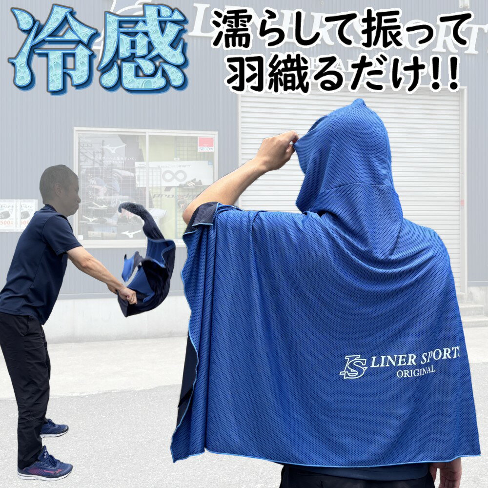 夏のカラダケア 冷感ポンチョ 冷たいクールマント 熱中症予防 ケープ フード付き ポンチョ 肩掛け 1年保証 ライナースポーツオリジナル LSALI041-BLUE