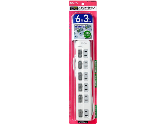 【マラソン限定2000円クーポン★ポイント2倍16日9:59迄】朝日電器 LEDスイッチ付タップ 上差2P6個口3m WLS-LU63EB(W) コード付き電源タップ2ピン 電源タップ OAタップ 配線パーツ 家電