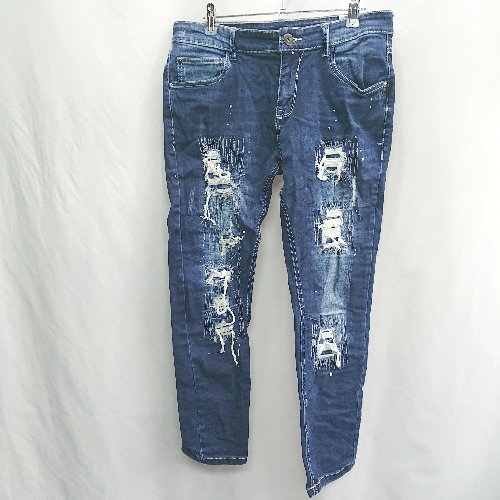 ◇ Θ BIKE STAR ダメージ加工 ステッチデザイン ストレートジーンズ サイズXL ダークブルー系 メンズ E 【中古】