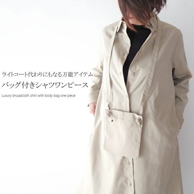 【商品説明】 上品な光沢のある上質さで程よいきちんと感を演出してくれるシャツワンピース。 ゆったりとリラックス感のある着心地で、裾に向かって広がるきれいなAラインが体型を美しくカバーしてくれます。 そして、アクセサリー感覚で使える同素材で仕立てた小ぶりなボディーバッグがシンプルコーデをこなれ感たっぷりに、ぐっと垢抜けて見せてくれます。 きれいにも、ナチュラルにも、閉めて良し、羽織って良し、バッグを使った上級者スタイルも、一着で何通りも着こなしが楽しめる万能アイテムです。 【素材】 綿58% ナイロン38% ポリウレタン4% 【サイズ9号フリー(普段M〜LLサイズの方に適しています)】 【平置き実寸サイズ】 肩幅43cm 着丈116cm 身幅約59cm 袖丈56cm 袖ぐり26cm 裾幅85cm 【バッグ】 横18cm×縦20cm 【原産国】 中国製 【モデル】 身長160cm(普段M〜L(9号強)サイズ着用) ※必ず実寸サイズもご確認ください。 【着用感】 ゆったりとした着心地です。上半身を華奢に見せてくれるパターンでお腹や腰周りはふわりとカバーしてくれるので一枚で絵になります。 ケータイなどをさっとしまえる小ぶりなバッグがこなれた印象です。 【注意】 商品画像の色合いは、お使いのPCやモニタ等によって実際の色と多少異なって見えることがあります。 予めご了承下さい メーカー希望小売価格はメーカー商品タグに基づいて掲載しています