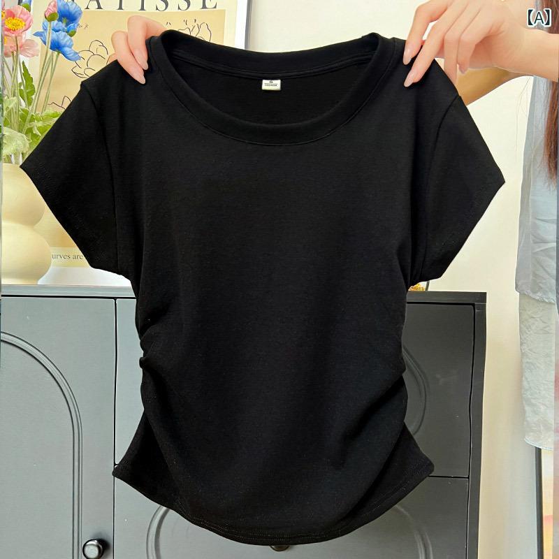 レディース チュニック シャツ 半袖 レディース チュニック シャツ 半袖 H 595 ラウンドネック Tシャツ レディース 夏 薄手 ウエスト シワ スリムフィット トップス 万能 右 肩 半袖x2