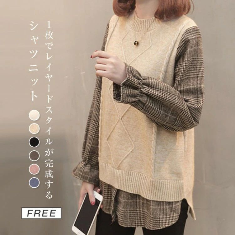 チュニック ブラウス レディース フェイクレイヤード 長袖 ケーブルニット 切り替え シャツブラウス チェック きれいめ 春秋 冬 トップス 重ね着風 大人 通勤 仕事 ゆったり エレガント フォーマル 大きいサイズ 30代 40代 きれいめ 送料無料