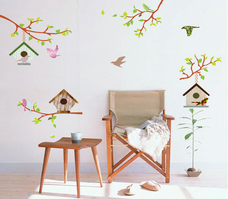ウォールステッカー カラフル鳥小屋 50×70cm 壁紙 シール 賃貸OK はがせる 剥がせる DIY 模様替え インテリア キュート 木 グリーン 癒し バード 小鳥 子供部屋 キッズ 子供 元気