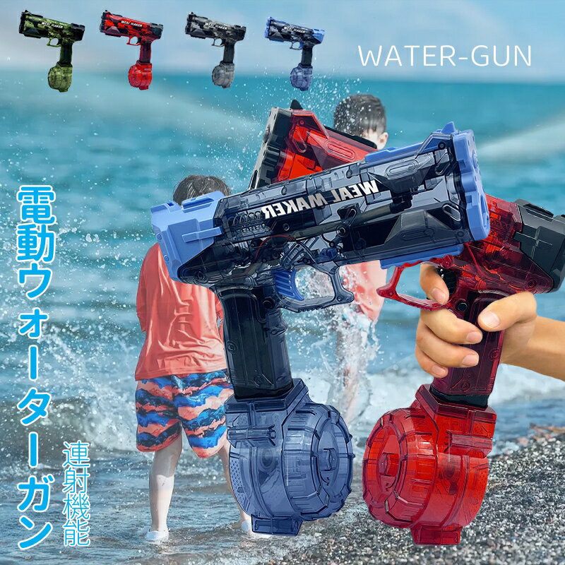 商品説明次世代の電動水鉄砲、話題のウォーターガンが新登場!高速連射と自動連射の機能を、トリガーを引くだけで楽しめます!夏のイベントが盛り上がる次世代のアウトドアおもちゃです!暑い夏の日に、家族や友人と一緒に遊べる!子供たちも大喜び間違いなし!次世代のウォーターガンは、1秒間4回の高速連射で約10mの遠距離照射を実現!使用方法は簡単のタンクに水を入れてトリガーを引くだけ!大容量サイズのタンクが付属されているので、一度の充填で長時間遊ぶことができます。電動ウォーターガンは、フル充電で約1時間使用する事ができます!カラーブラック、ブルー、グリーン、レッド商品情報本体:26×19cmタンク:26×32cm素材:MABS付属品:ウォーターガン本体/タンク(大)/タンク(小)/バッテリー×3/防水メガネ注意事項:1.当商品を使用した際に起こった事故ならびに損害等については一切の補償をいたしかねます。2.ご使用に支障のない擦り傷剥がれ等に関しましては、交換、返品などの対応は承れません。3.色違い、相性が悪いなどの理由で返品交換は受け付けできません。商品説明次世代の電動水鉄砲、話題のウォーターガンが新登場!高速連射と自動連射の機能を、トリガーを引くだけで楽しめます!夏のイベントが盛り上がる次世代のアウトドアおもちゃです!暑い夏の日に、家族や友人と一緒に遊べる!子供たちも大喜び間違いなし!次世代のウォーターガンは、1秒間4回の高速連射で約10mの遠距離照射を実現!使用方法は簡単のタンクに水を入れてトリガーを引くだけ!大容量サイズのタンクが付属されているので、一度の充填で長時間遊ぶことができます。電動ウォーターガンは、フル充電で約1時間使用する事ができます!カラーブラック、ブルー、グリーン、レッド商品情報本体:26×19cmタンク:26×32cm素材:MABS付属品:ウォーターガン本体/タンク(大)/タンク(小)/バッテリー×3/防水メガネ注意事項:1.当商品を使用した際に起こった事故ならびに損害等については一切の補償をいたしかねます。2.ご使用に支障のない擦り傷剥がれ等に関しましては、交換、返品などの対応は承れません。3.色違い、相性が悪いなどの理由で返品交換は受け付けできません。