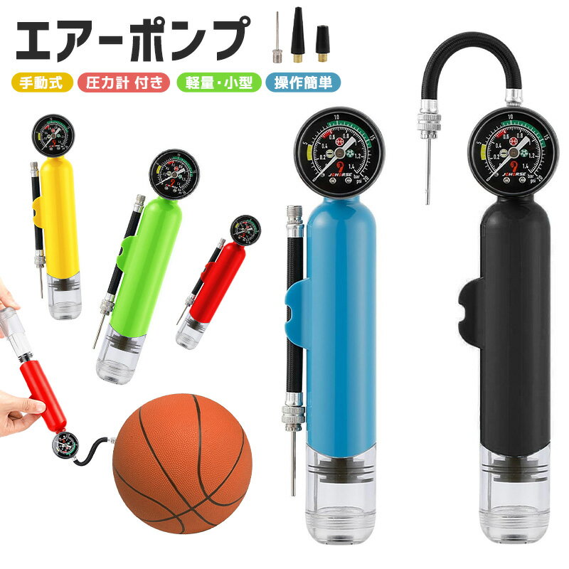【楽天1位】ボールポンプ 小さい 小型 機能性 シンプル コンパクト バスケ サッカーボール バレーボール 空気入れ ハンドポンプ 操作簡単 空気圧をチェックできる 空気圧計付ポンプ 気圧計測 軽量 安い 5Color 空気針2本 携帯性 風船 予備用針付 ボール専用ポンプ