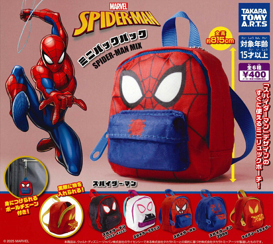 タカラトミーアーツ スパイダーマン ミニバックパック SPIDER-MAN MIX 【全6種セット】 新品・未開封品 様々なスパイダーマンのミニリュックが登場! 【セット内容】 ・スパイダーマン ・スパイダーグウェン ・スパイダーマン(マイルズ・モレラス) ・スパイダーハム ・アイアン・スパイダー ・スパイダーマン 2099