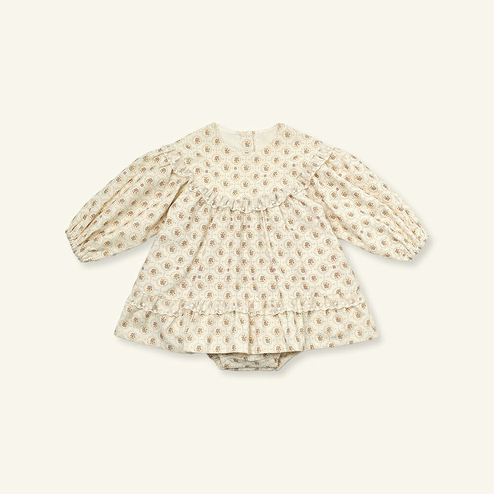 ヴィンテージ感のある花柄と繊細なレースフリルが可憐な印象を与える、コーデュロイスカート付きボディスーツ。ワンピースのようなシルエットでありながら、股下のスナップボタンでおむつ替えも簡単にできる実用的なデザインです。やわらかなコーデュロイ生地が赤ちゃんをやさしく包み、一日中快適に過ごせます。ゆったりとしたシルエットがふんわりとした愛らしさを演出し、普段使いにもお出かけにもぴったりの一枚です。 ※モニターの発色により実際と異なる場合があります。