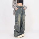 デニムパンツ 男女兼用 ウォッシュ加工 ユーズド加工 マルチポケット ドレープ感 アメリカンヴィンテージ ストリート ワークパンツ ワイドフレア カジュアル 着回し ミドルウエスト ノンストレッチ ブルー 秋冬