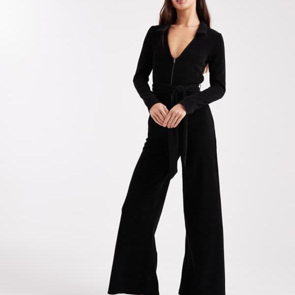 【送料無料】 エイソス レディース ジャンプスーツ トップス ASOS DESIGN cord zip collared wide leg jumpsuit in black Black