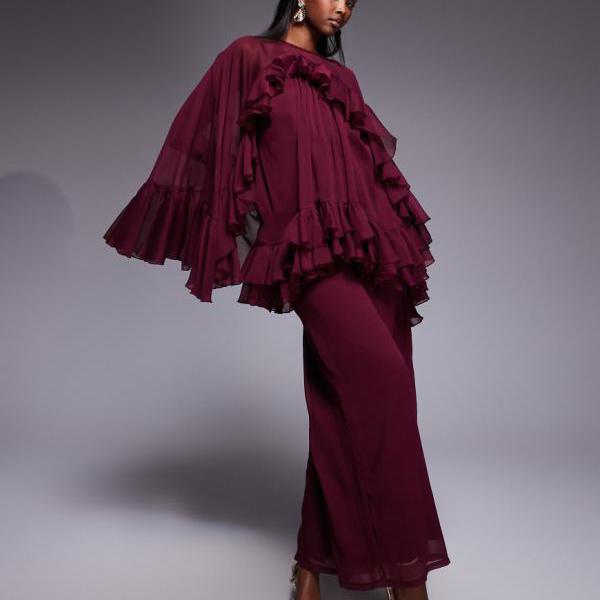 エイソス ASOS asos ASOS DESIGN ボリュームラッフルケープジャンプスーツ(ベリー) オールインワン レディース 女性 インポートブランド 小さいサイズから大きいサイズまで