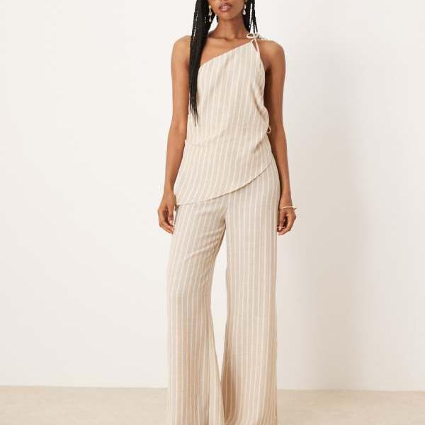 エイソス ASOS asos ASOS DESIGNのストーンストライプのアシンメトリータイ付きリネンジャンプスーツ オールインワン レディース 女性 インポートブランド 小さいサイズから大きいサイズまで