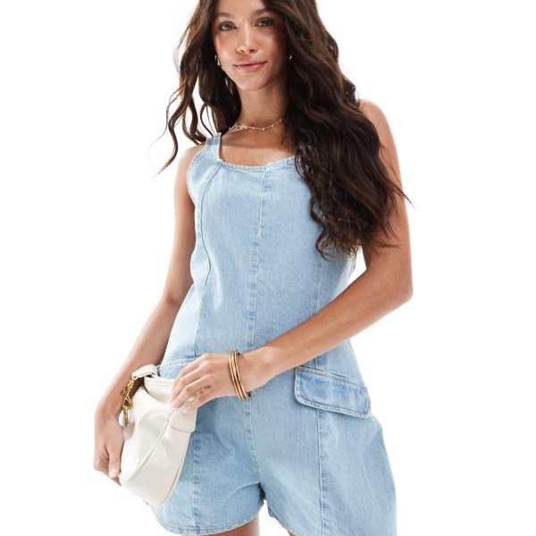 エイソス ASOS asos ASOS DESIGN デニム スクープネック プレイスーツ(ポケットディテール付き、ライトミッドブルー) オールインワン レディース 女性 インポートブランド 小さいサイズから大きいサイズまで