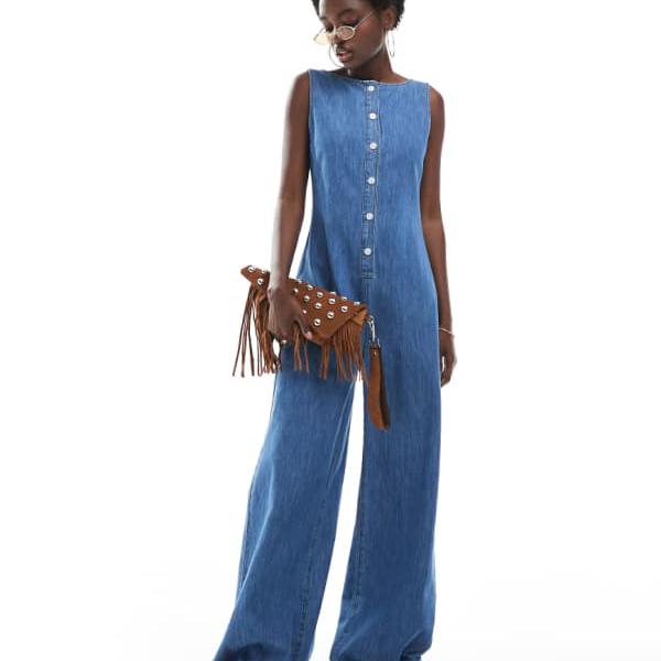 エイソス ASOS asos ASOS DESIGN デニム スラッシュネック ジャンプスーツ(ミッドブルー) オールインワン レディース 女性 インポートブランド 小さいサイズから大きいサイズまで