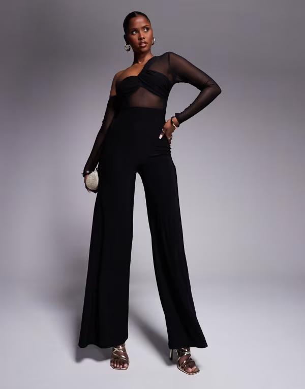【送料無料】 エイソス レディース ジャンプスーツ トップス ASOS DESIGN long sleeve mesh mix jumpsuit with fallen shoulder in black Black