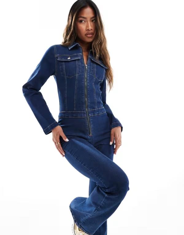 【送料無料】 エイソス レディース ジャンプスーツ トップス ASOS DESIGN long sleeve stretch 70s jumpsuit in dark blue Dark blue