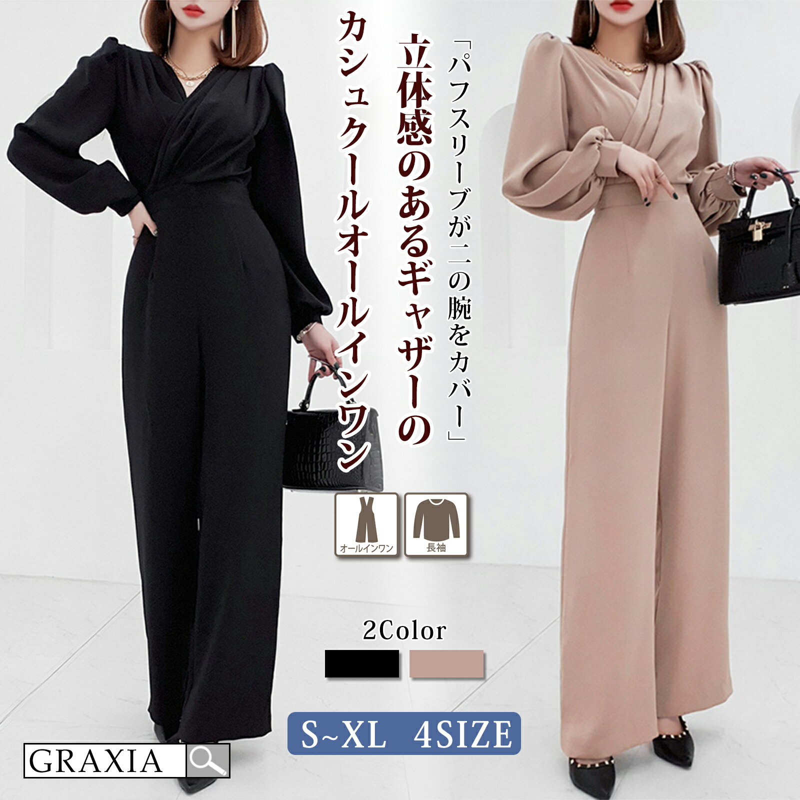 ■■商品情報■■ギャザーカシュクールワイドオールインワン(キャバスーツ・CABARETSUIT)。立体感のあるギャザーにドレープがかったカシュクールがフェミニンなデザイン。パフスリーブが二の腕をカバーし華奢な印象を与えエレガントに。また、ワイドストレートパンツでクールでスタイリッシュな印象を与えます。シンプルなデザインなので様々なオケージョンにおすすめです。■■商品詳細■■カラーベージュ、ブラックサイズS、M、L、XLセット内容オールインワン 1点素材ポリエステル100%透け感★★☆☆☆伸縮性★☆☆☆☆胸パッドなしストラップなし裏地なし生地の厚み薄いファスナーありポケットなし■商品画像と実際の商品の色味や仕様が異なる場合がございます。■商品には多少の糸ほつれ等がある場合が御座いますので予めご了承下さい。■■サイズ■■————————————————————スタッフによる素人採寸となりまして、平置きでの計測となります。サイズ表 / S / M / L / XL着丈 / 139cm / 140cm / 141cm / 142cm袖丈 / 59cm / 59cm / 61cm / 61cmバスト / 86cm / 90cm / 94cm / 102cmウエスト / 69cm / 73cm / 78cm / 80cmヒップ / 96cm / 98cm / 104cm / 108cm股下 / 65cm / 66cm / 67cm / 68cm【検索用ワード】キャバ キャバドレス キャバワンピ 韓国ドレス 韓国キャバドレス ミニドレス ミディアムドレス ロングドレス パーティードレス チャイナドレス ラウンジ キャバクラ キャバ嬢 GRAXIA グラシア 9999901