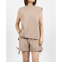 ◇身長166cm B83 W62 H86/モデル着用サイズM前後2WAYで着用できるノースリーブトップスと、ハイウエストのキュロットのセットアップ。トップスの肩部分はタックのデザインになっているので、二の腕をスッキリと見せてくれます。ショーツのウエストはフロントはフラット、バックはゴム仕様。ゆったりシルエットで涼しげに着こなせ、ドロスト仕様のパンツがアクセントに。サンダルを合わせてラフな夏のコーデにぴったりです。M : 【着丈】51-66cm / 【肩幅】41cm / 【胸囲】120cm / 【ウエスト】66cm / 【ヒップ】98cm / 【股上】33cm / 【股下】11cm別カラーはこちら! ベージュ ブラック