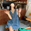 デニムサロペットワンピース レディース Vネック ロング丈 ジャンパースカート ゆったり カジュアル オーバーオール オールシーズン 体型カバー きれいめ 大人可愛い