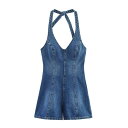 オールインワン レディース デニム Vネック ホルターネック バックオープン ハイウエスト ストレートシルエット フレンチ 甘辛スタイル ノースリーブ ショート丈 ブルー カジュアル 春夏