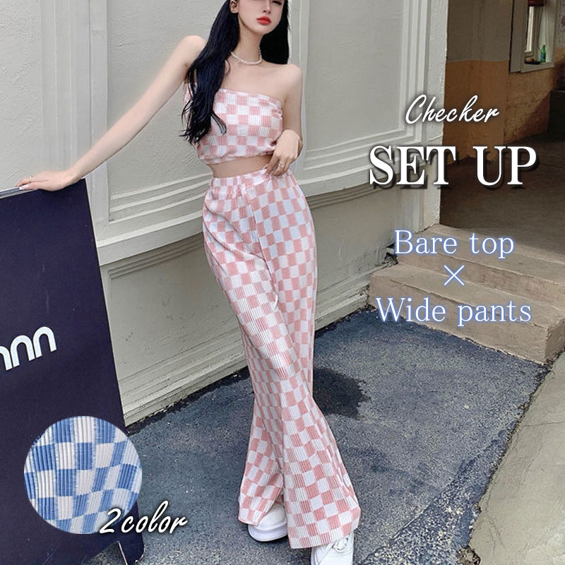 チューブトップ ロングパンツ 2点セット セットアップ レディース スポーティ インナー ハイウエスト ワイドパンツ オーバーサイズ ビッグシルエット 体型カバー テロテロ ウエストゴム メール便送料無料 韓国風 おしゃれ トレンド
