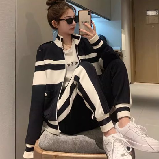 セットアップ 長袖 ジャケット ロングパンツ ジャージ スポーティー サイドライン バイカラー ゆったり ショート丈 スタイルアップ 楽ちん 大人 お姉さん レディース 華やか 大人可愛い 春 夏 S M L XL 2XL 3XL 4XL 脚長 美脚 着痩せ 可愛い デート 女子会 普段使い