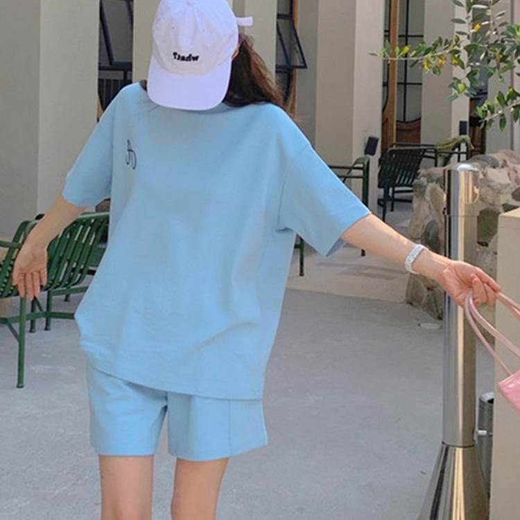 2色 セットアップ スウェット パンツ ジャージ バッグ付き 上下セット グレー ブルー 半袖 ショートパンツ ハーフパンツ クルーネック プルオーバー ワンポイントロゴ ドロップショルダー スポーツウエア スポーティー ズボン カッコイイ 個性的 カジュアル ラフ 大人可愛い