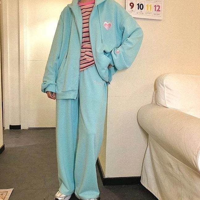5色 セットアップ スウェット パンツ ジャージ 上下セット ブルー グリーン グレー ジッパー ローズレッド ドロップショルダー フード付き スポーツウエア スポーティー パーカー ズボン カッコイイ 個性的 カジュアル ラフ フロントジップ 長袖 大人可愛い シンプル おし