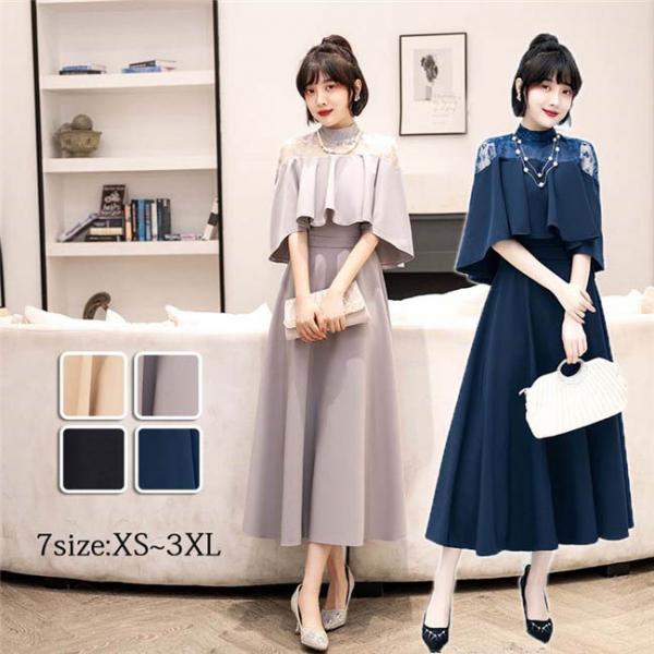 ドレス パーティードレス ワンピース フォーマルドレス ひざ丈 レース 袖あり ケープ 大きいサイズ 結婚式 演奏会 お呼ばれ 大人 30代 40代 50代 可愛い かわいい 着痩せ 二の腕カバー おしゃれ レディース 即日発送 あす楽