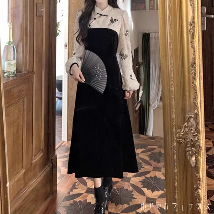 レディース ドレス パーティードレス ワンピース ロング丈 ミモレ丈 カラー切り替え チャイナ風 アシンメトリー 抜け感 大人かわいい 上品 シンプル スタイルアップ モノトーン ブラック 黒 長袖 結婚式 2次会 お呼ばれ パーティー お食事会 ディナー ランチ お出かけ 秋冬